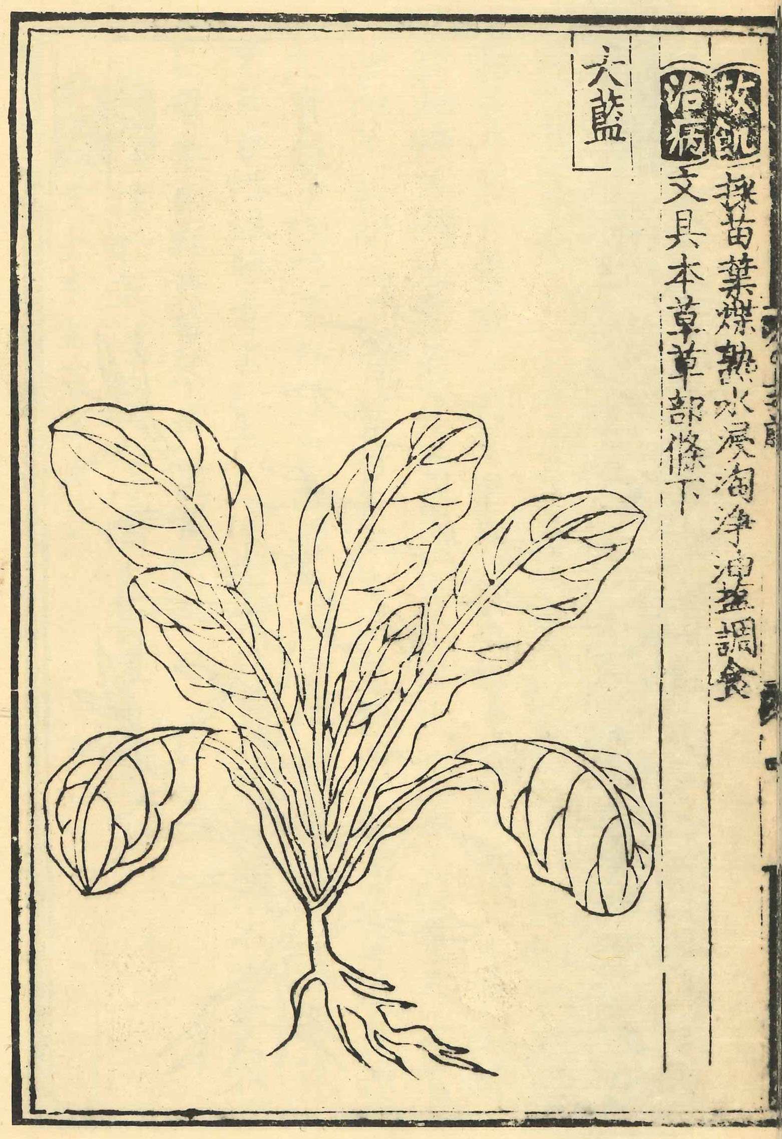 平澤 ,今處處有之 。人家園圃 中多種 。苗高尺餘,葉類白菜 葉,微厚而狹窄尖𧣪,淡粉青色。莖叉,稍間開黄花,結小莢,其子黑色。本草謂菘藍 ,可以為靛染青 ,以其葉似菘菜 故名菘藍 ,又名馬藍 ,《爾雅 》所謂葳 ,馬藍 是也。味苦 性寒