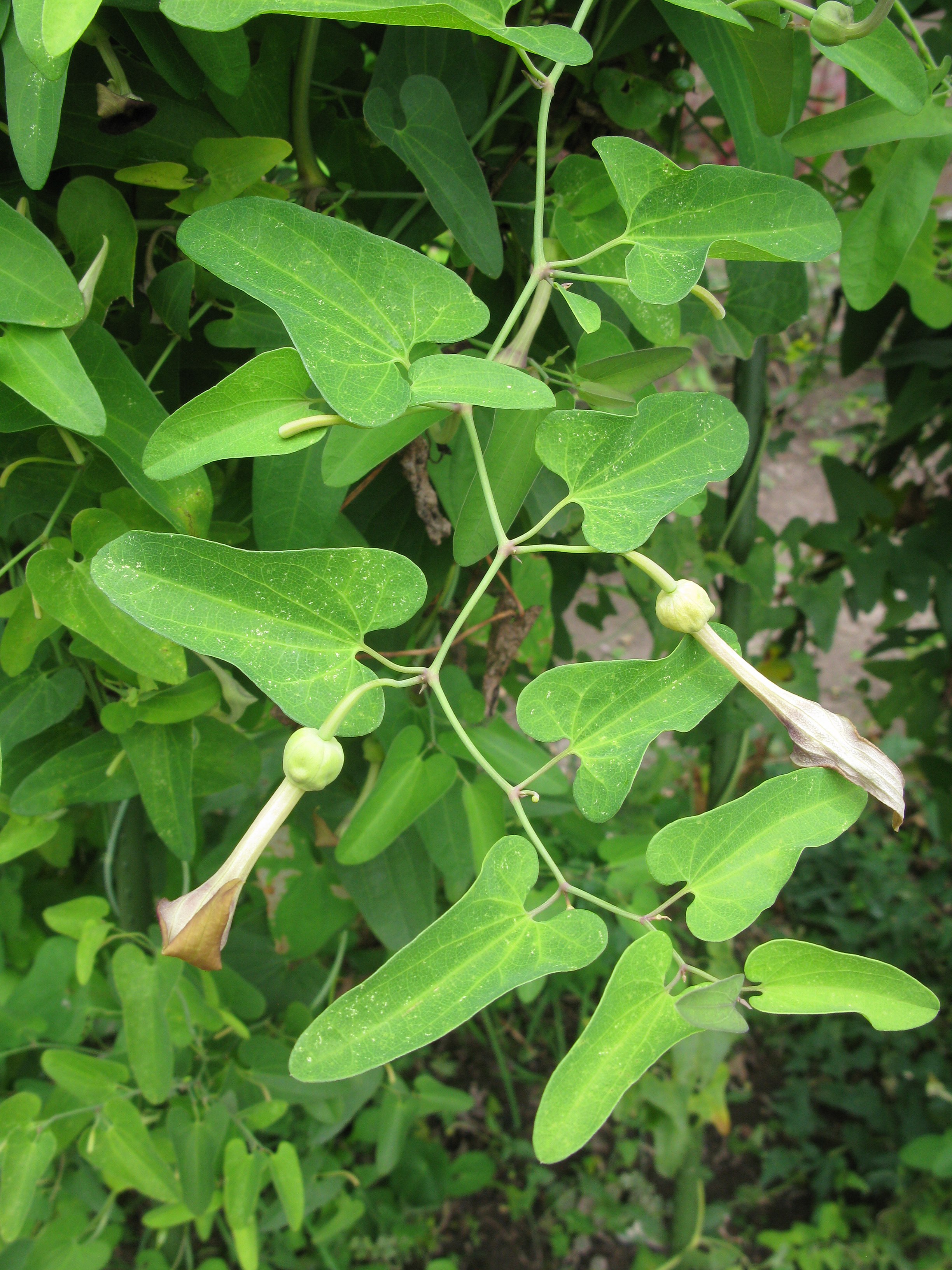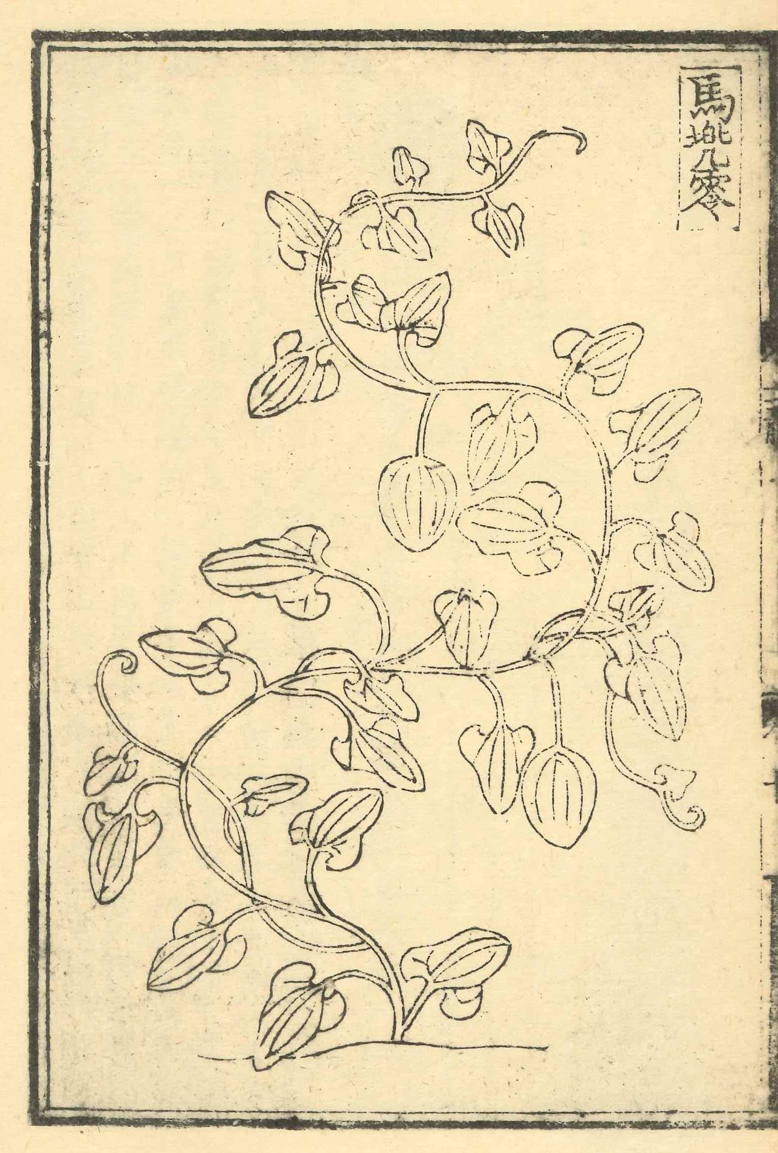 馬兠零 一名雲南根 ,又名土青木香 。生關中 及信州 、滁州 、河東 、河北 、江淮 、夔 (音馗)、浙 州郡皆有。今高阜 (音負)去處亦有之。春生苗如藤蔓,葉如山藥 葉而濃大,背白,開黄紫花,頗類枸杞 花,結實如鈴,作四五瓣,葉脫時鈴尚垂之,其狀如馬項鈴,故得名。味苦 性寒 。又云︰平 ,無毒 。【救飢】採葉