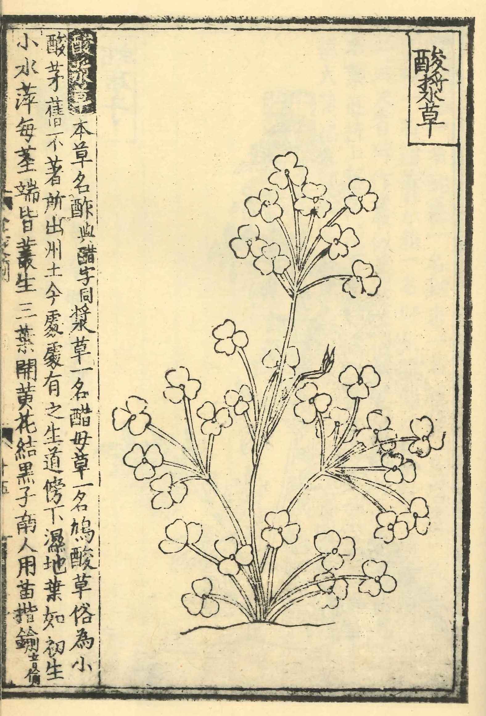 酸漿草 本草名酢(與醋字同)漿草 。一名醋母草 ,一名鳩酸草 ,俗為小酸茅 。舊不著所出州土,今處處有之 。生道傍