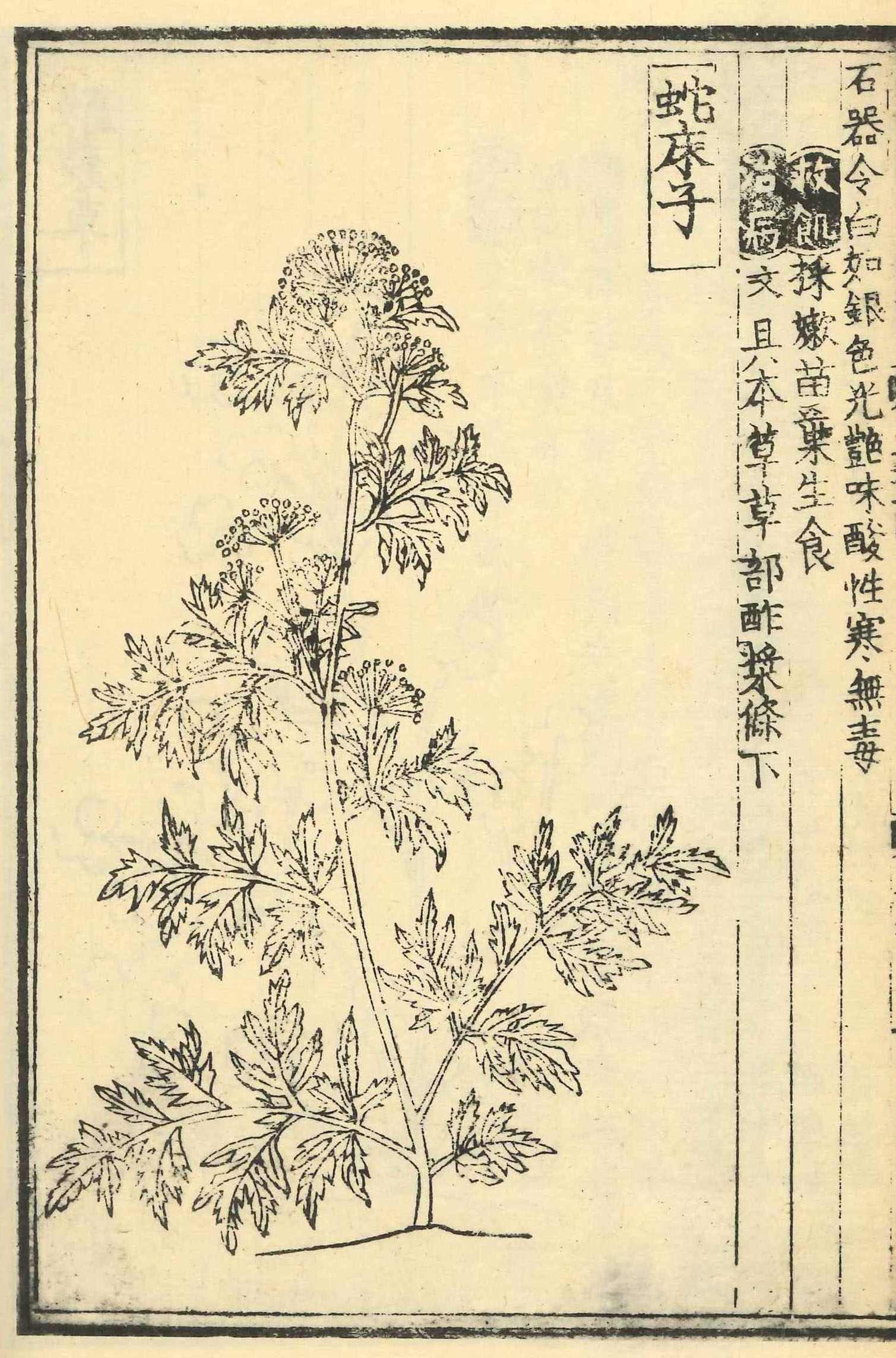 蛇床子 一名蛇粟 ,一名蛇米 ,一名虺牀 ,一名思益 ,一名繩毒 ,一名棗棘 ,一名牆蘼 。《爾雅 》一名盱 。生臨淄