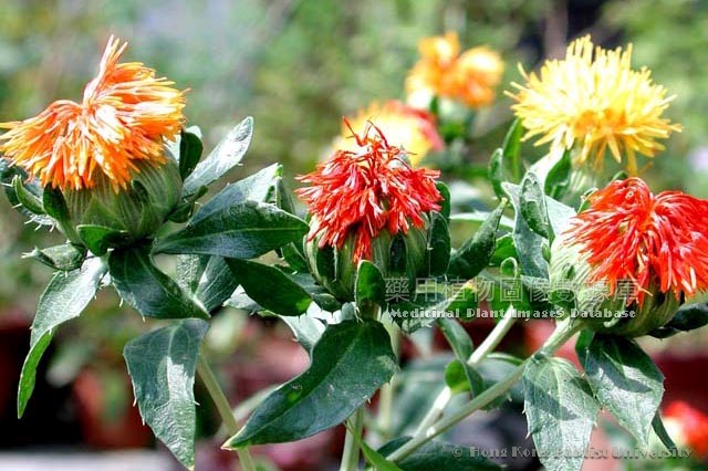 亦種之 ,今處處有之 。苗高二尺許,莖葉有刺,似刺薊 葉而潤澤,窊(五化切)面。稍結梂彙(音求胃)亦多刺,開紅花,蘂出梂上,圃人採之,採已複出,至盡而罷。 梂中結實,白顆如小豆 大,其花曝乾,以