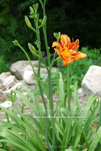 萱草花 俗名川草花 ,本草一名鹿葱 。生山野 ,處處有之 。花名宜男 ,《風土記 》云︰懷妊婦佩其花生男,故也。人家園圃 中多種 ,其葉就地叢生,兩邊分垂,葉似菖蒲 葉而柔弱,又似粉條兒菜 葉而肥大,葉間攛葶,開金黄花,味甘