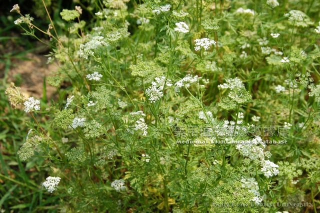 田野 中有之。根土黄色,與蜀葵 根相類稍細短,莖葉俱青綠色,莖深而葉淡,葉似青蒿 葉闊大,又似米蒿 葉而稀踈,莖似茴香 。開細白花,結實似胡荽 子而大。味甘